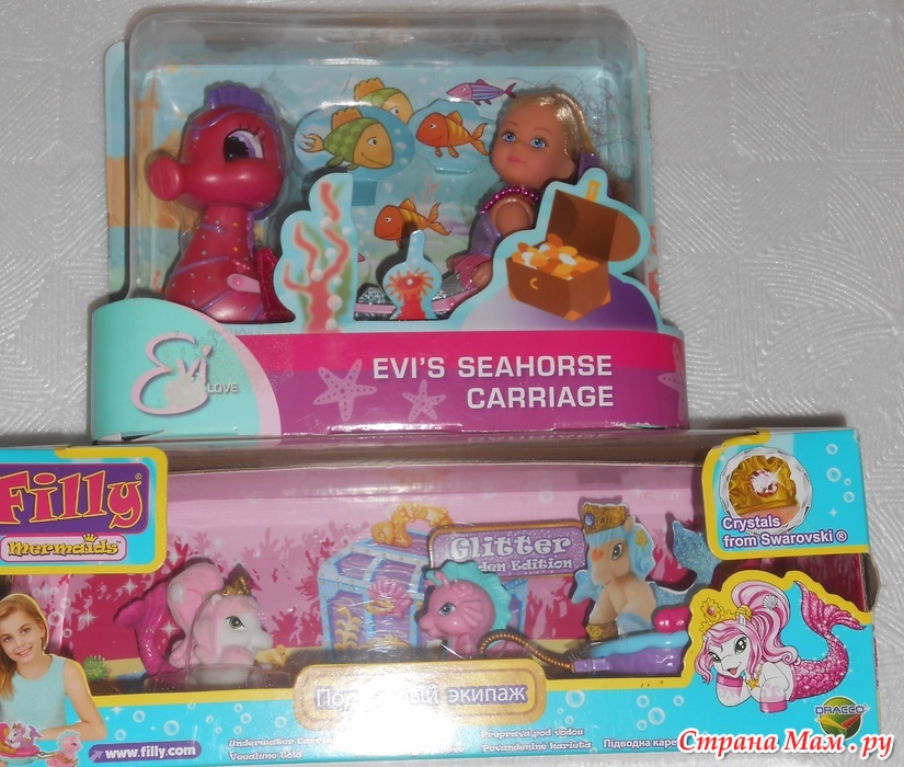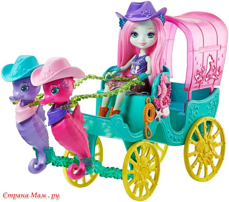 Есть и кукольная мечта. Хочу такой набор. Это серия кукол "Enchantimals - подружки и их зверушки", олицетворяющих животных, к кукле прилагается аналогичный питомец, например, с девочкой-лисой, которую я показывала как-то в комментариях для Фиалки, идет питомец лисичка. В этом наборе девочка олицетворяет морского конька и в карету запряжены тоже морские коньки, но уже в виде рыбок.