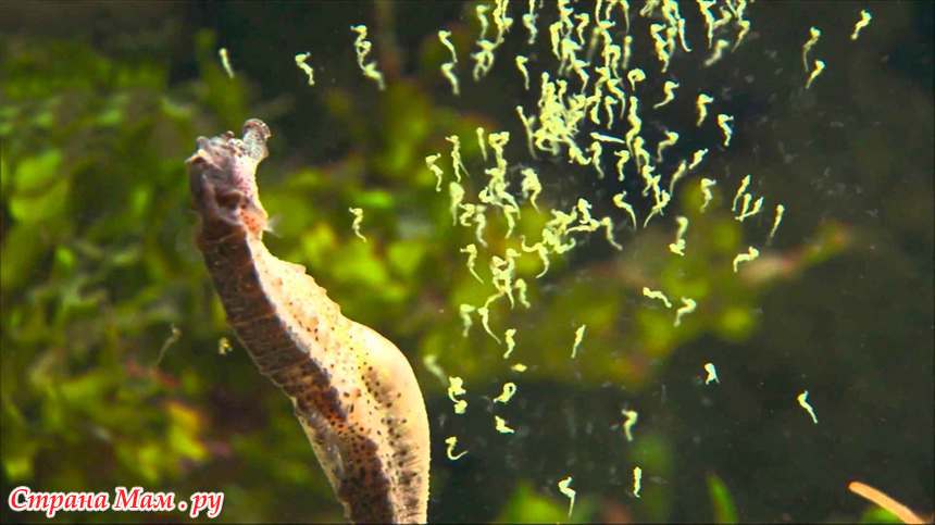 Морские коньки размножаются довольно необычным образом, ведь у них мальков вынашивает самец. У морских коньков нередко встречаются моногамные пары. Брачный период морских коньков – это удивительное зрелище. Пара, которая собирается заключать брачный союз, скрепляется хвостами и танцует в воде. В танце коньки прижимаются друг к другу, после чего самец открывает специальный карман в брюшной области, в который самка забрасывает икринки. В дальнейшем самец в течении месяца вынашивает потомство.