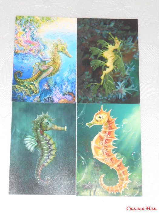 Покупала как-то современные открытки у одного мужчины, он узнав, что я коллекционирую морских коньков, прислал в подарок 4 открыточки с морским коньком, чему я была очень рада! В советских открытках я встречала конька только в наборах, конечно же я их купила.