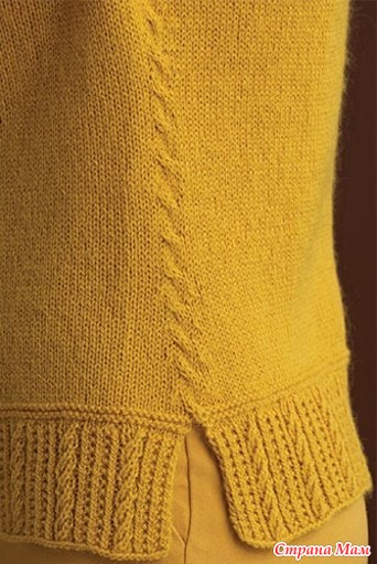 Нижний край переда и спинки вяжутся резинкой отдельно прямыми и обратными рядами для образования боковых разрезов. Затем вязание продолжается круговыми рядами до начала проймы.