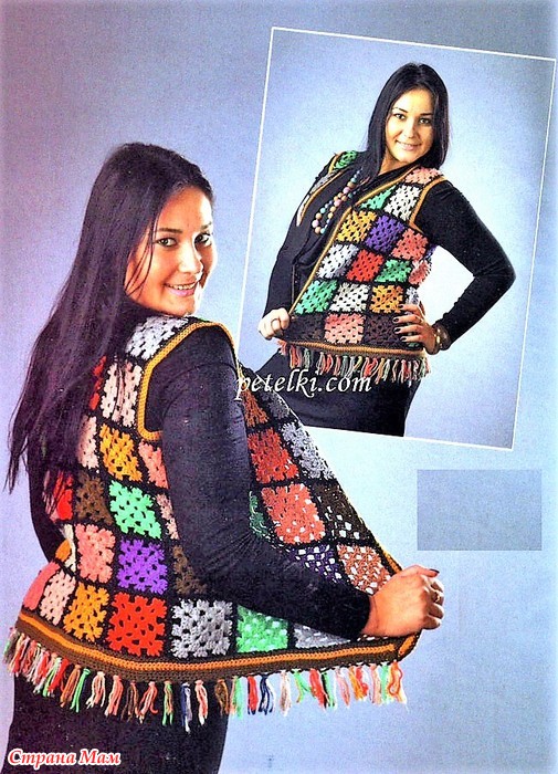 В эно-стиле. Жилет из разноцветных мотивов бабушкин квадрат. Крючок.