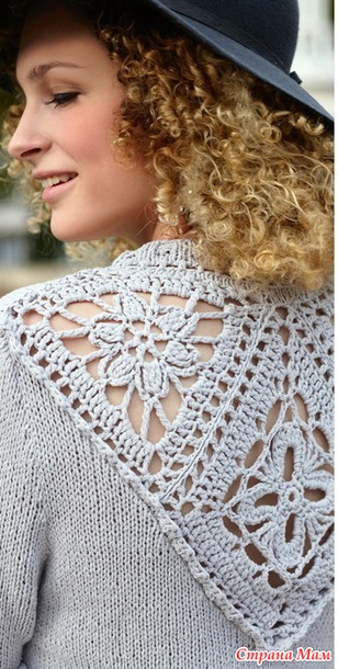 На спинке — треугольная кружевная вставка, связанная крючком, по краям — нежная ажурная полоска, напоминающая мережку: все это придает пуловеру романтический вид.