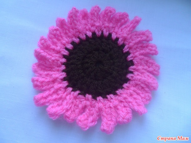 в этом ряду вяжем позади работы, за заднюю стенку петли 2го ряда ( за переднюю стенку мы вязали 3й ряд)для удобстванемного отгнуть лепестки4 вп ( сч.как стс2н) 2 стсн в ту же петлю, * 1 вп, пр.п, 3 стсн в сл.п, 1 вп, пр.п, [ угол - 2 стсн, стс2н - в сл.п., 3 вп, пр.п., стс2н, 2 стсн - в сл.п.] * от * до * повторить.