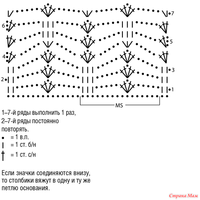Вязать согл. схеме. Ряды поворачивать, как обозначено. Начать с петель перед раппортом, раппорт постоянно повторять, закончить петлями после раппорта. Выполнить 1–7-й ряды 1 раз, затем 2–7-й ряды постоянно повторять.