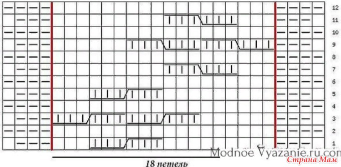 11-й ряд: кром. петля, 3 изнан., 3 лицев., перекрестить 3*3 влево, 9 лицев., 3 изнан., кром. петля.