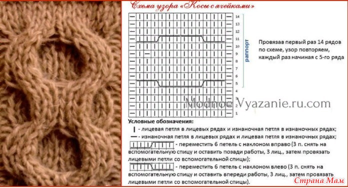 11-й ряд - * 2 изнаночные, 6 лицевых петель перекрестите налево, 6 лицевых петель перекрестите направо, 2 изнаночные *;