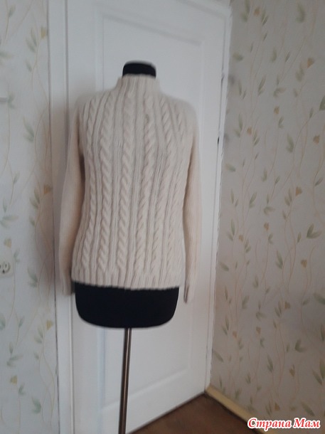 Решилась я все таки на свитер. Вязала реглан с низу, без швов. Единственный шовчик, там, где подрез рукава. Нитки ушли все, остался хвостик сантиметров 70. На воротник, как у свитера, не хватило, но и так хорошо получилось, горлышко закоывает. Спицы использовала номер 4, расход 10 моточков. Вязала без описания, с головы