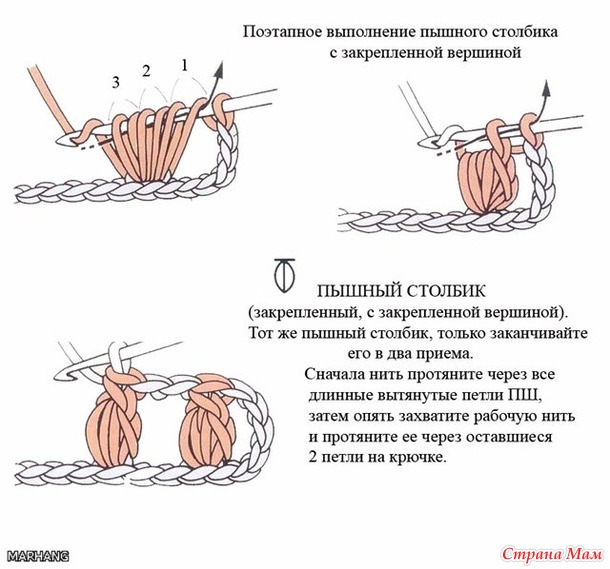В начале каждого ряда со столбиками с 2 накидами вместо первого ст.с2н свяжите 4 возд.п., в конце – 1 соед. столбик в 4-ю возд.п. начала ряда.