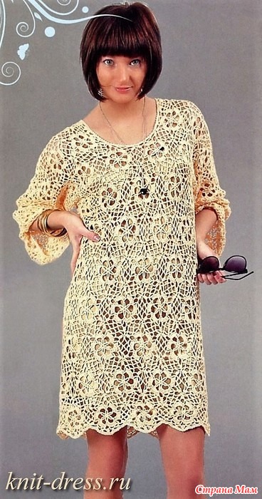 Платье свободного кроя, связать которое не составит труда. Смотреться будет превосходно за счёт визуальной целостности ажурного полотна - "цветы на сетке". В инструкции к модели которую я нашла, к сожалению не был указан расход пряжи. Думаю для данного размера предположительно ок. 700-800 г уйдет.