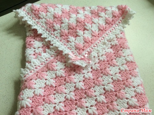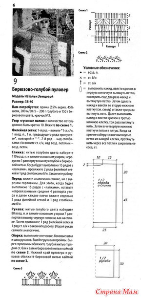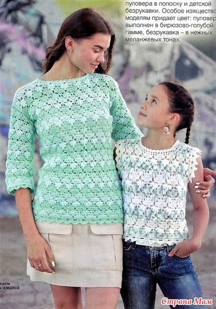 Оригинальный узор из пышных листиков лег в основу женского пуловера и детской безрукавки.Особое изящество моделям придает цвет. Пуловер выполнен в бирюзовоголубой гамме а безрукавака в нежных меланжевых тонах.