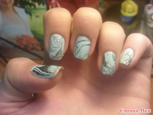 Теперь аккуратно погрузим наши ноготки в ёмкость (пальчики держите параллельно воде, опуская в место наиболее интересного рисунка), а излишки лака на поверхности уберём зубочисткой.
