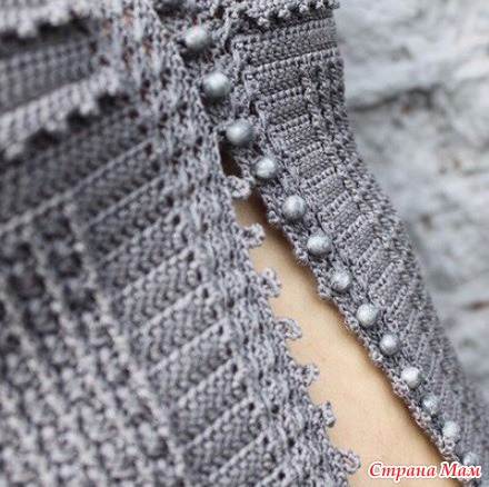 Элегантный жакет связан из пряжи стального цвета крючком. Большое количество маленьких перламутровых пуговиц цвета жакета украшают его планку. Пуговицы застегиваются на навесные петли. Если вы одеваете жакет на рубашку, то можно позволить себе не застегивать жакет на все пуговицы. Жакет имеет короткие рукава, и образ выглядит стильно, если вы сочетаете жакет с рубашкой белого цвета с длинным рукавом. Длина рукавов жакета доходит до середины локтя