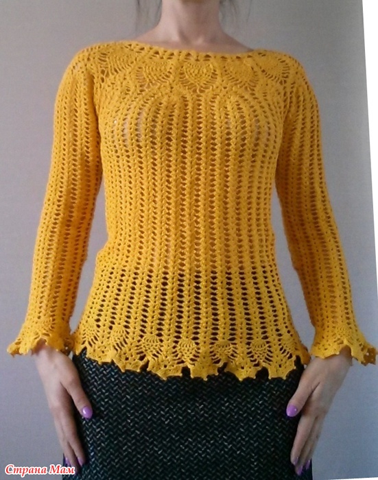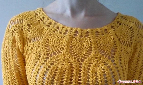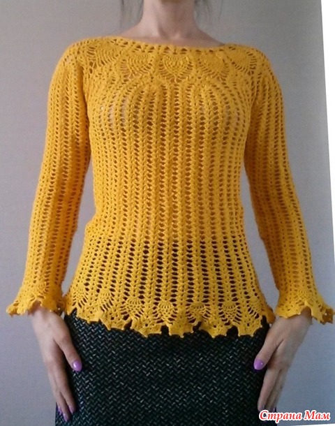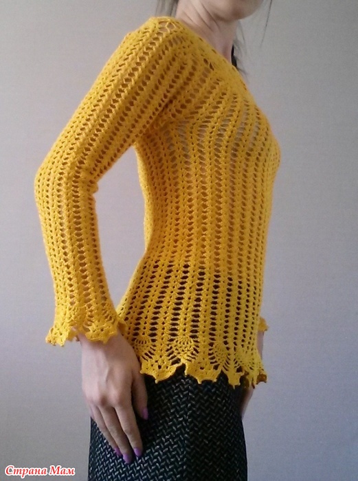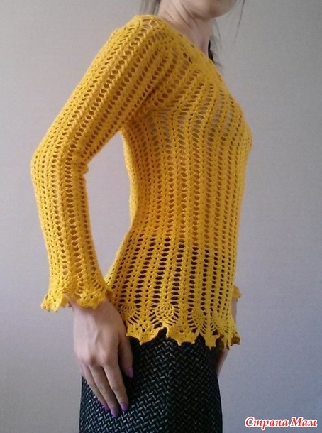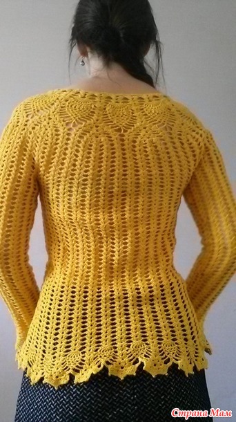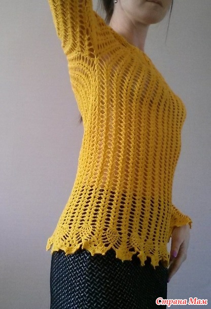 Но простите мне мою откровенность - окончание рукава неудачное, у оригинала лучше; и у вас кофточка длиннее чем у оригинала и расширяется, но не ложится по фигуре, а топорщится и поэтому низ не украшает изделие