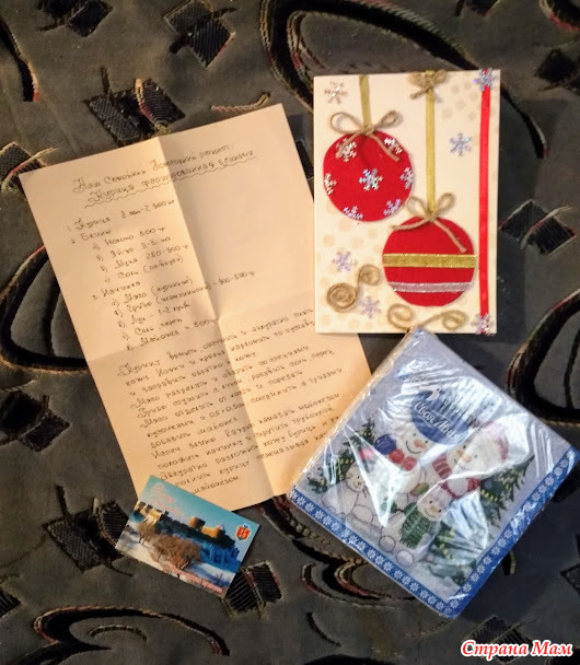 Вот какой красивый и вкусный рецептик прислала нам Галечка, а еще рукодельная открыточка с лучшими пожеланиями, салфеточки к столу и магнитик