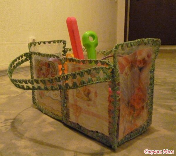 Предыстория - есть у нас велосипед, да багажник у него маловат, некуда игрушки складывать было для песочницы и мячи. Я решила используя подручный материал решить эту задачку. Сделала из пластиковых бутылок квадраты (верх и низ бутылок отрезала и сложила пополам), внутрь вставила завалявшиеся открытки, обвязала квадраты крючком, сшила все вместе и приделала ручку, чтобы за спинку сиденья крепить. И вот что получилось