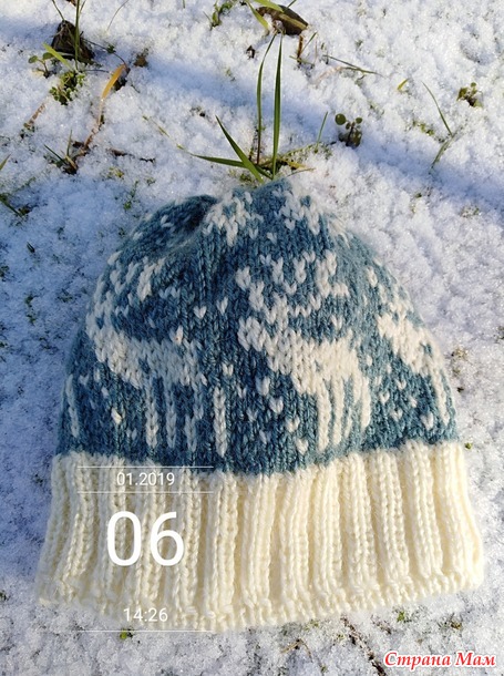 Шапочка с оленями.Есть еще снуд и варежки,но они активно носятся дочерью,а шапка у меня была на переделке,укорачивала макушку.Турецкая полушерсть,расход 80 грамм .