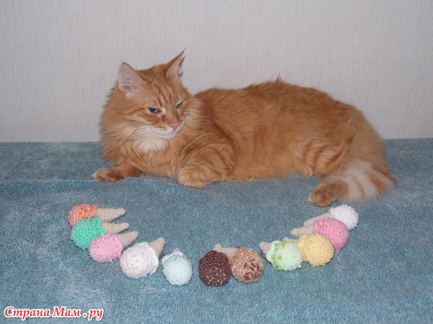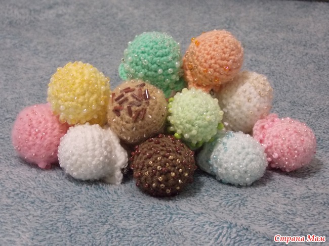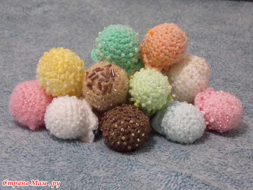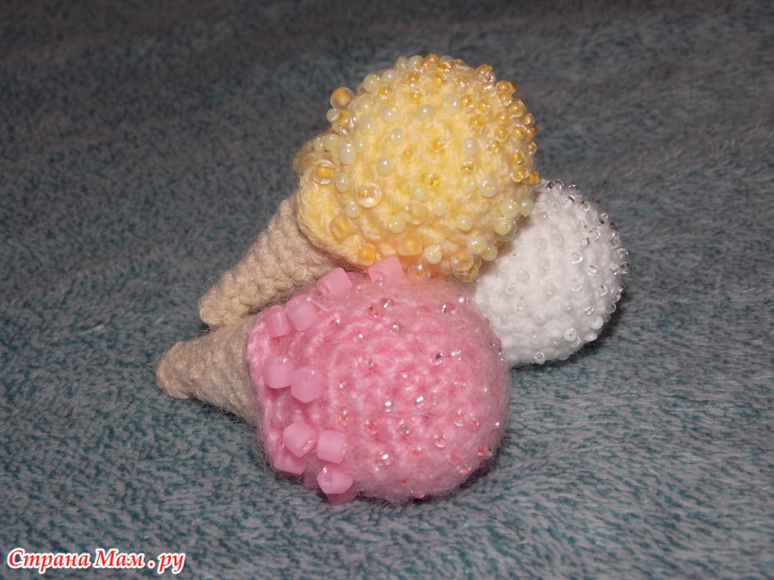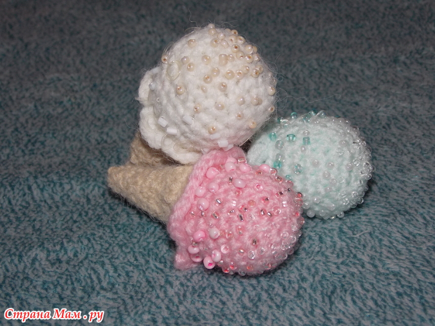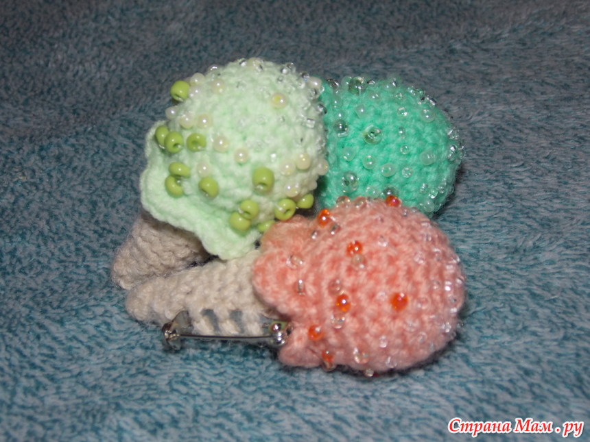 Начну с "мороженого". После того как мороженое было связано, я украсила его бисером в тон, а по задней стеночке пришила булавку.
