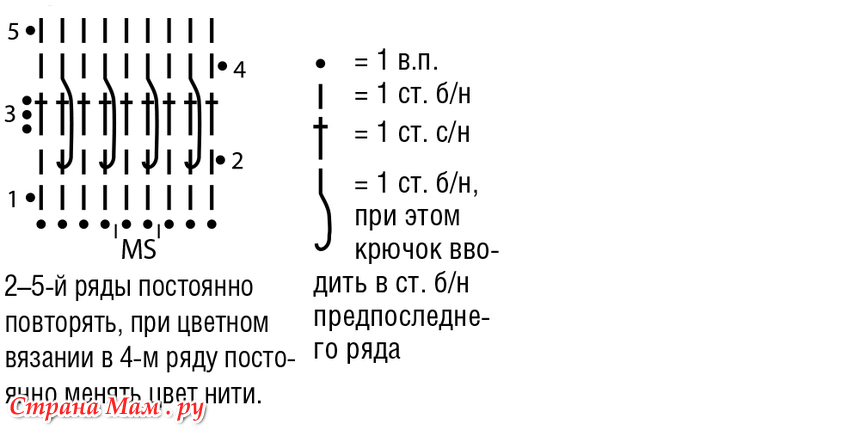 Вязать в круговых рядах согл. схеме. Начать с петель перед раппортом, раппорт постоянно повторять, закончить 1 соед. ст. в 1-ю петлю кругового ряда. 2–5-й круговые ряды постоянно повторять, при этом начать желтой нитью и вязать по 4 ряда попеременно с серой нитью. Каждый круговой ряд закончить 1 соед. ст.