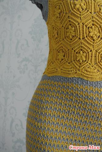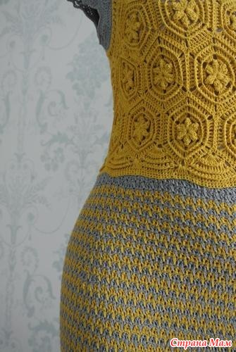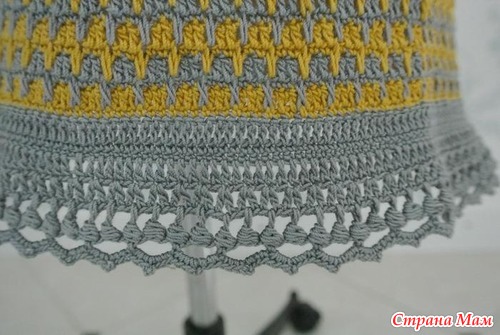 Пряжа (59% хлопка, 41% вискозы; 105 м/50 г) — 300 (350) 400 г желтой и 300 (350) 400 г серой; эластичная тесьма шириной 2 см соответствующей длины для талии; крючок №4.