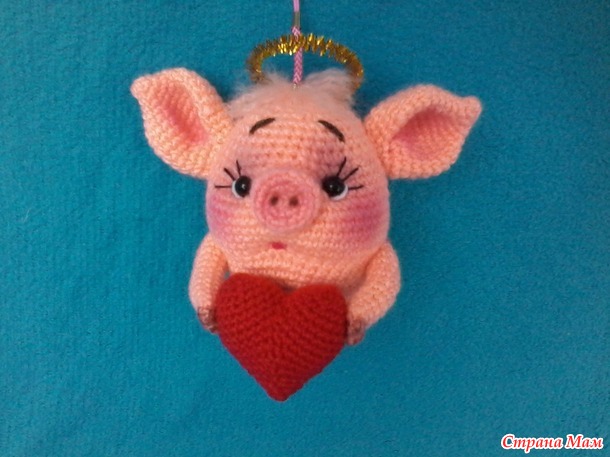 Совсем скоро праздник всех влюбленных -День Святого Валентина. Этот относительно новый для нас праздник прижился в России и стал одним из любимых) но в отличие от Европы, где традиционно в этот день влюбленные дарят друг другу шоколадные сердечки и розы, в России подарки более разнообразны, но непременно в них присутствует сердечко. В общем, предлагаю в качестве праздничного подарочка вязаную игрушку-брелочек Хрюша-ангелочек)рост без нимба 12см, связан из акриловой пряжи, наполнен холофайбером. Цена 500р. При желании на сердечке могут быть начальные буКвы имен влюбленных! сделанные из стразиков.