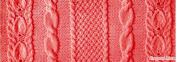 Набрать 103 п. + 2 кром. и петли распределить след. образом: 1 кром., 6 п. изн. глади, 17 п. коса с листиками, 6 п. изн. глади, 6 п. коса В, 6 п. изн. глади, 21 п. жемчужного узора с косами, 6 п. изн. глади, 6 п. коса А, 6 п. изн. глади, 17 п. коса с листиками, 6 п. изн. глади, 1 кром.