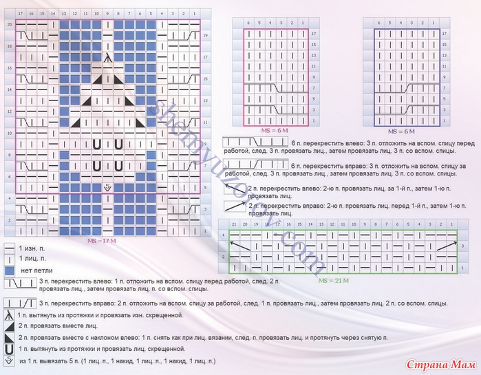 Коса А: вязать согласно схеме В, на которой приведены только лиц. р., в изн. р. все петли вязать изн.