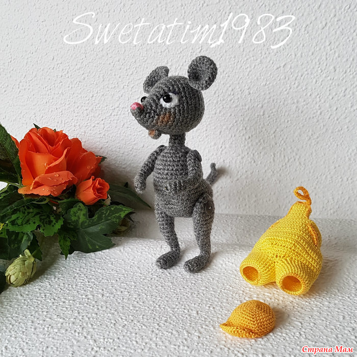 Мышонок получился примерно 16 см стоя, связала его из акрила 300 м в 100 гр. кр. № 2, 5.
