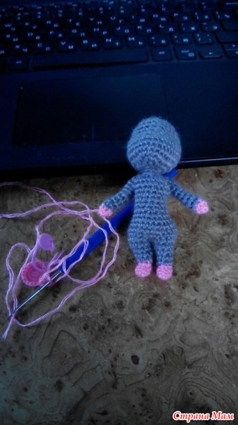 но мне же все неймется, решила, а что если толстую пряжу на ножках и ручках заменить ирисом ? как результат родилась еще одна малышка, капризная и привередливая, хотела ей шапочку-капор, но эта вредина отказалась