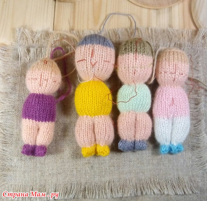 Ручки сделаны шнуром на 8 петель и не набиты. Тушка куклы порядка 24 или 26 петель. В итоге рост 8-9 см. Первая братия была на 32 петли и росточку до 13 см. Юбчонки вяжутся снизу на 60 петелек. Юбочки- песня. Но по низу очень желательно два или четыре ряда платочной , дабы не закручивался подол. И лицевая гладь мне видится самой удачной, очень плотная чтобы, сантиметра 2. Затем количество петель уменьшается в два раза и затягивается на талии.