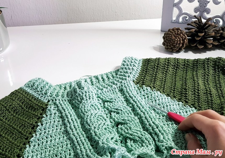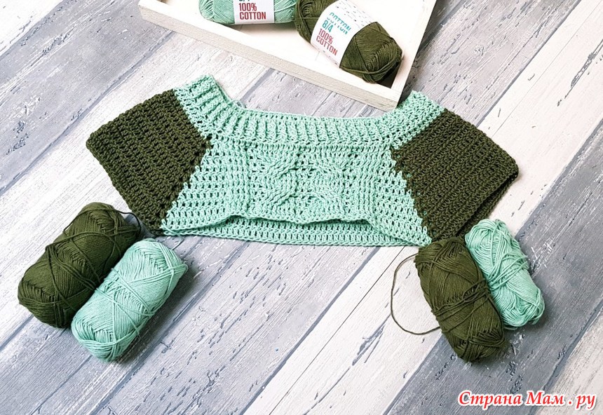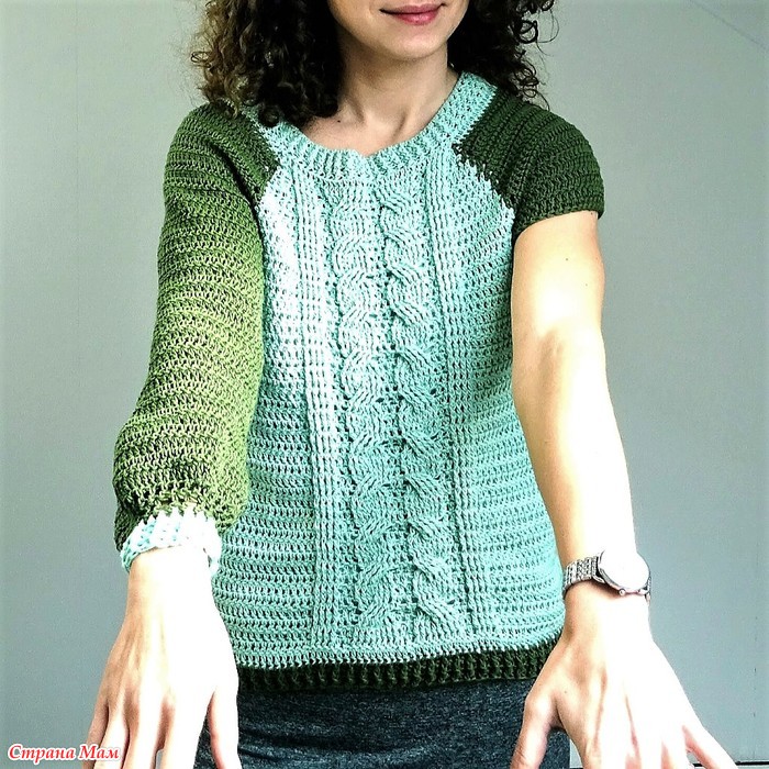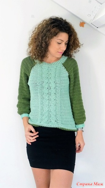 Этот пуловер с рукавами реглан выполнен из двух видов пряжи.Он вяжется сверху вниз плотным узором с рельефной вставкой.Пуловер прекрасно подойдет для весны.