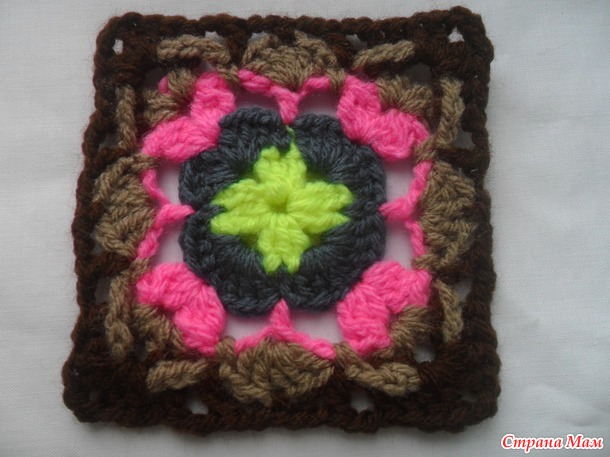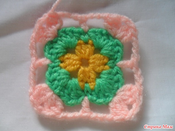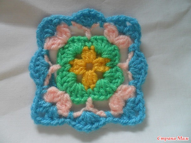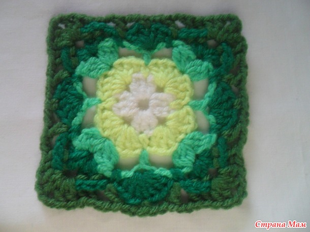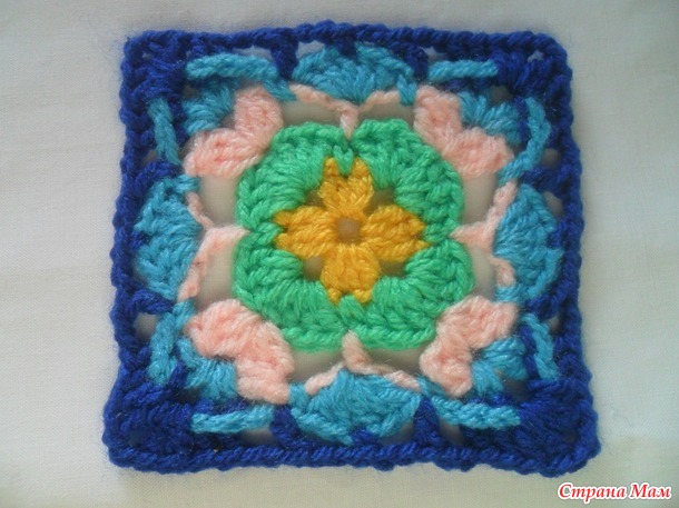 Размер мотива у всех будет разный. Он зависит от пряжи,размера крючка и плотности вашего вязания.