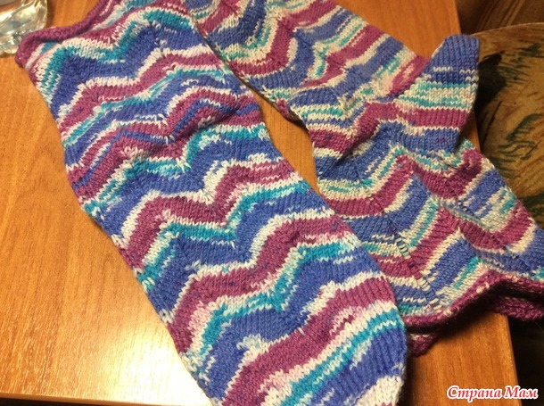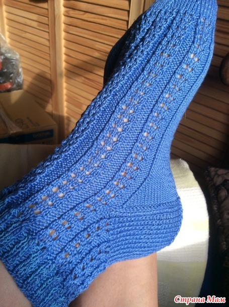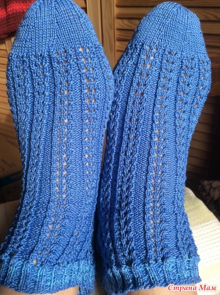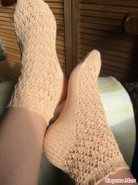 Чуть жестковатые даже после стирки получились, но ведь ПОЛУЧИЛИСЬ!!! Ушло ниток чуть меньше половины клубочка (75 грамм)Вторую пару вязала осознанно: выбирала цвет и очень уж хотелось попробовать схемку ажура, предложенную Марией ПИ в Странемам.Нитки взяла помягче - «Ромашку», спицы взяла потоньше- 1,3. Если в первые носочкиэластичную ниточку в резинку продевала после окончания вязания, то тут решила резинку вязать с эластичной ниточкой. Ниток ушло почти 70 грамм, от моточка осталось совсем чуть-чуть. Результатом осталась довольна.
