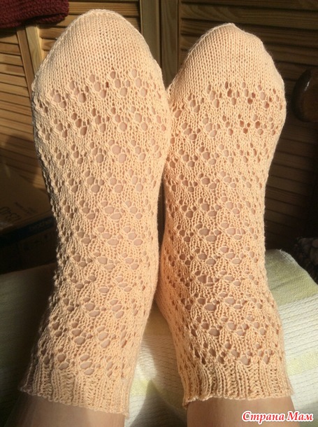 Всем, доброго времени суток! В моем глубоком детстве ( конец 60- х, начало 70- х годов прошлого века) мама вязала мне гольфы из катушечных ниток тонюсенькими спицами, но зато разных цветов и разными рисунками. Были гольфы, связанные резинкой, а были ажурные - с дырочками, чаще всего белые: для праздника.А мне захотелось связать для себя нынешней х/ б носочки - ведь скоро лето. Первую пару связала из того что под руку попало: ниточки «Лилия», спицы- 2,0.