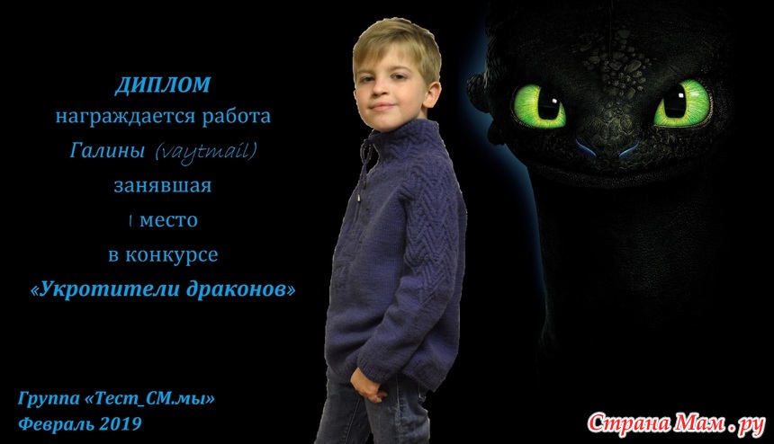 Первое место заняла работа Галины (vaytmail) - https://www.spletenie.ru/users/vaytmail/stranamam/