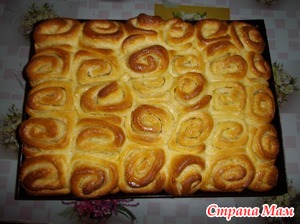 Тесту дать подойти, раскатать, намазать начинкой (200гр. сливочного масла + 1/2 сахара ), завернуть колбаской, разрезать на кусочки, шириной 2 см, выложить на противень, дать подойти, выпекать в хорошо разогретой духовке.