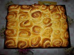 Тесту дать подойти, раскатать, намазать начинкой (200гр. сливочного масла + 1/2 сахара ), завернуть колбаской, разрезать на кусочки, шириной 2 см, выложить на противень, дать подойти, выпекать в хорошо разогретой духовке.