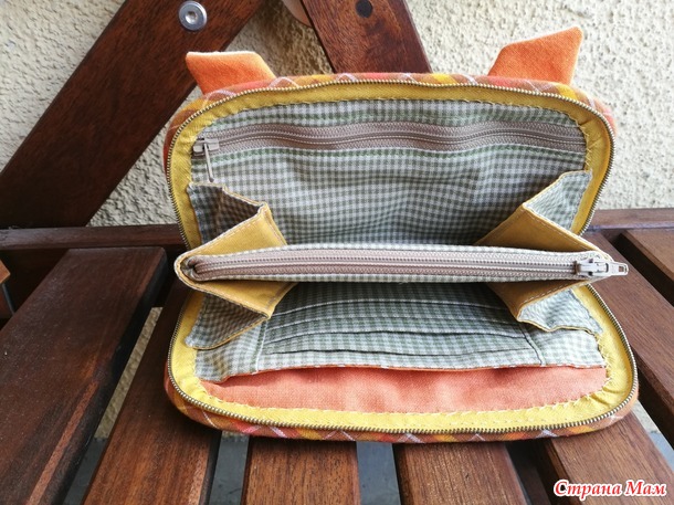 Снаружи полностью ручная работа: аппликация, стежка, сборка, пришивание молнии.внутри кармашки шиты на машине, сборка - ручная работа.