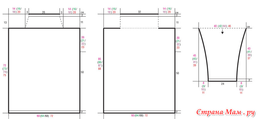 Через 72 (73) 74 (75) cм от наборного ряда закрыть с обеих сторон по 29 (33) 37 (41) п. для плеч, средние 64 п. для горловины временно оставить.