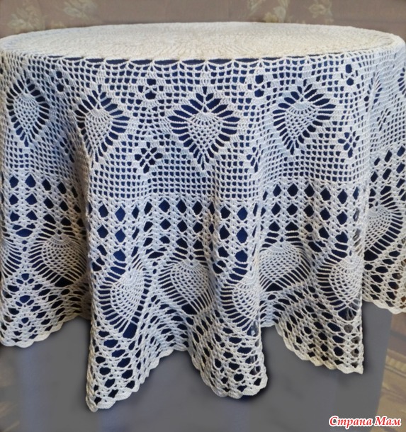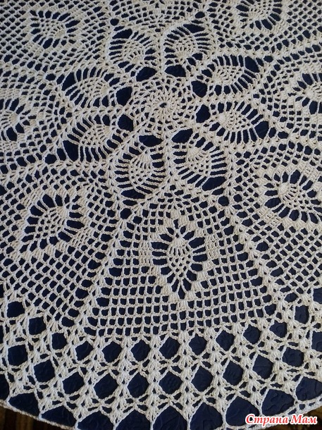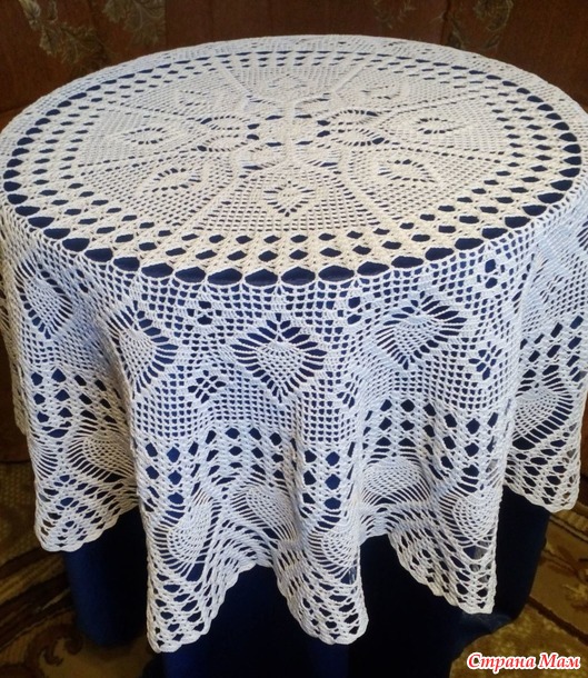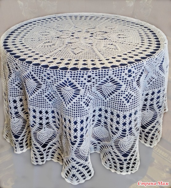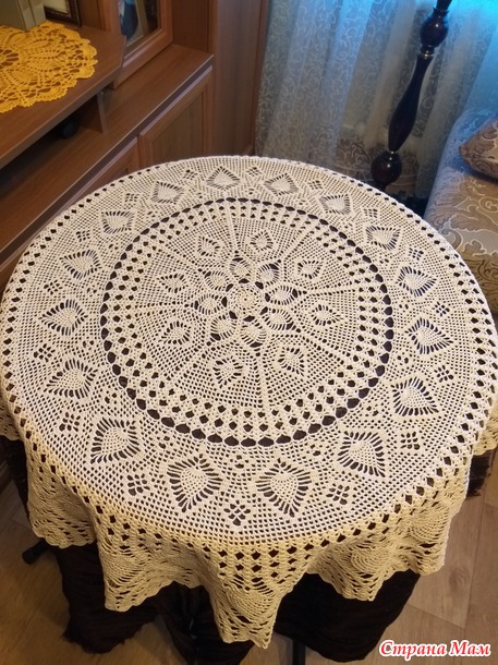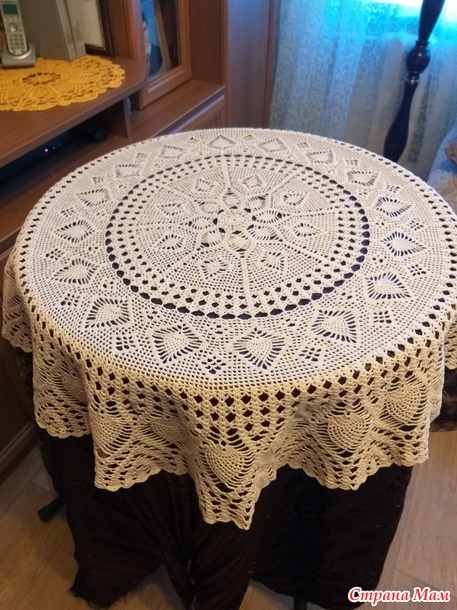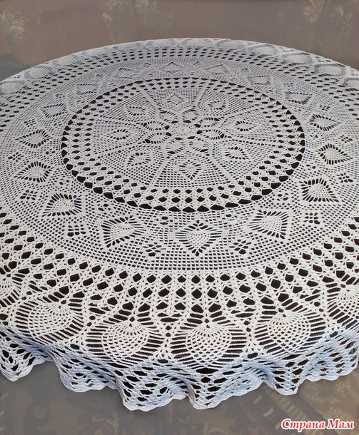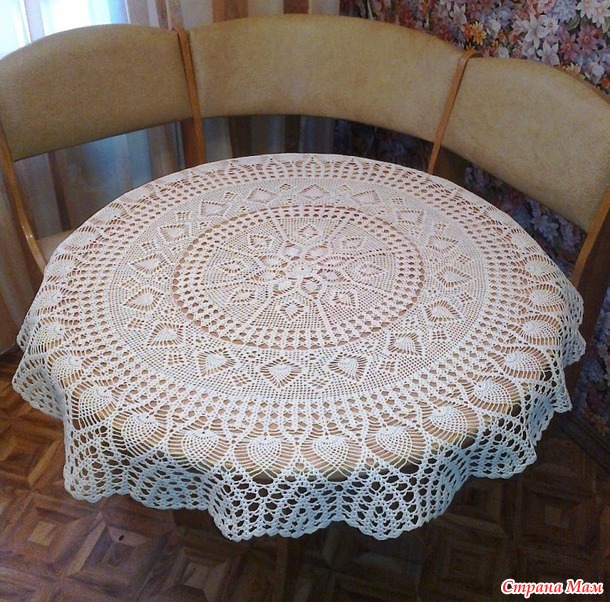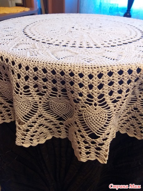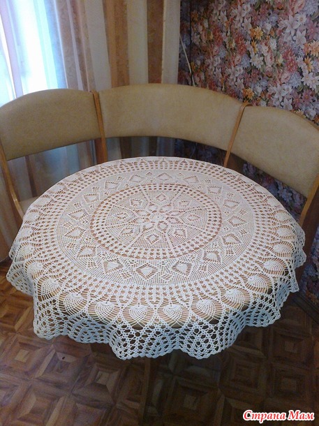 Расход пряжи на изделие 450 гр. Крючок 1,4. Размер скатерти в диаметре 140 см. Фото сделаны на столах 60 см и 110 см.