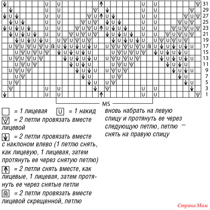 Число петель кратно 16 + 1 + 2 кромочные = вязать согл. схеме. На ней даны лицевые ряды. В изнаночных рядах петли и накиды провязывать изнаночными. Начать с 1 кромочной и петель перед раппортом, раппорт постоянно повторять, закончить петлями после раппорта и 1 кромочной. Выполнить 1 раз 1—32-й ряды, затем повторить еще 2 раза 3—32-й ряды = 92 ряда.