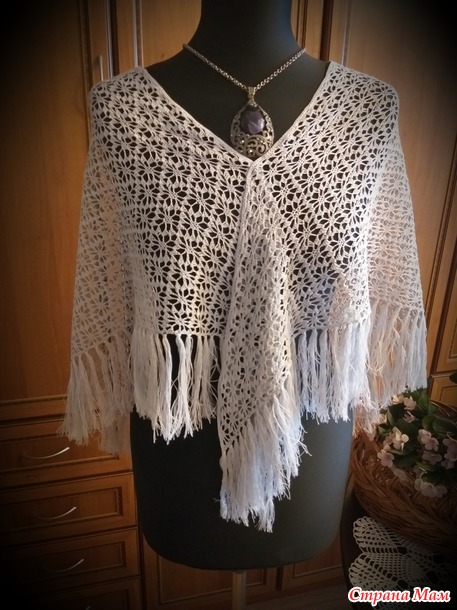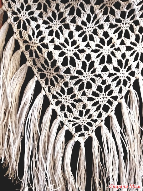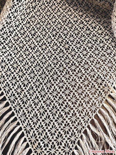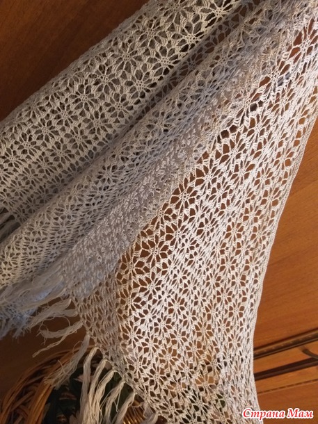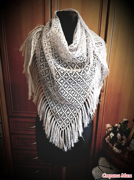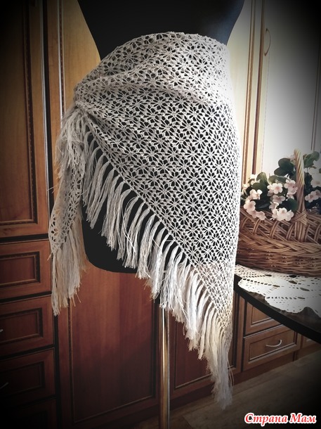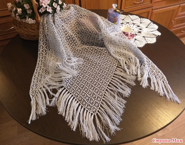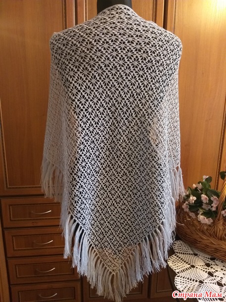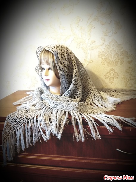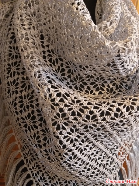 Эта нежнейшая, как дуновение ветерка шаль связана мной крючком из тончайшей 100%льняной пряжи серо-серебристого цвета.