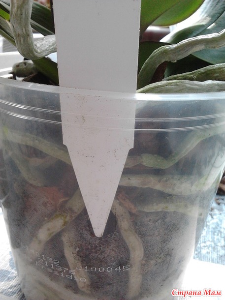 Вставляем его по стенке горшка с той стороны где растёт цветонос