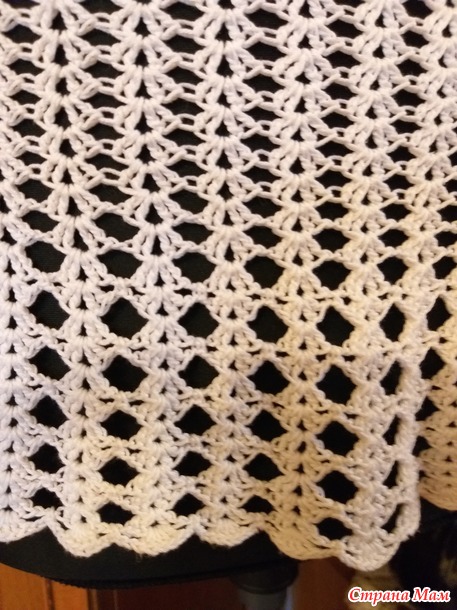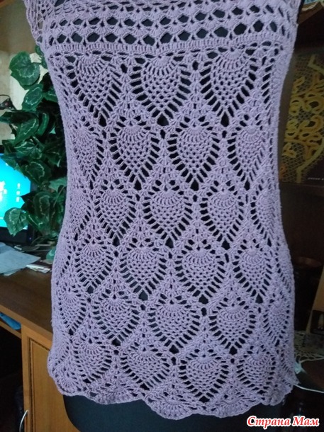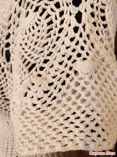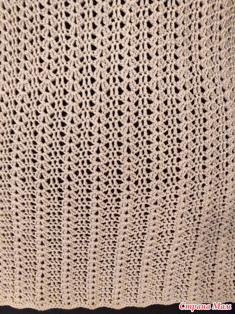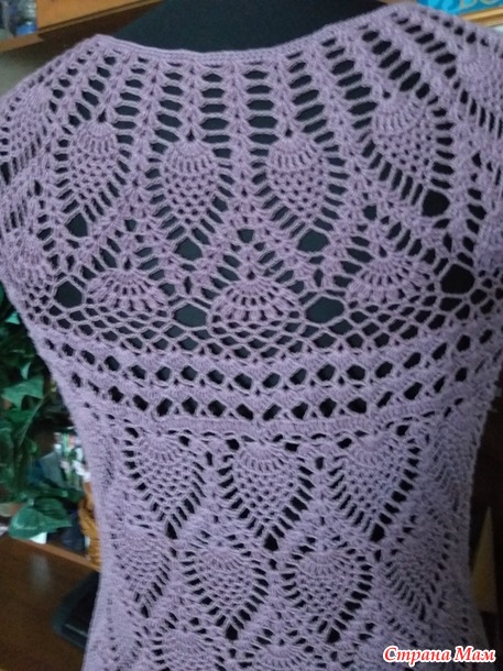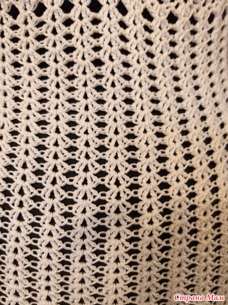 Расход пряжи на изделие 200 гр., крючок 1,25. Размер 48 - 50. Длина по спинке 55 см. Вязала сверху вниз по схеме из интернета.