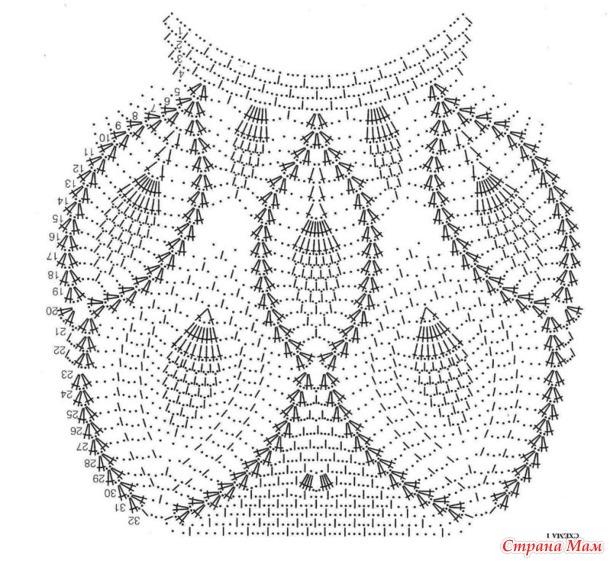 Для нижней части кофточки использовала схемы из интернета, начинала по первой схеме, затем приталивала путем смены номера крючка, а для низа изделия использовала вторую схему.