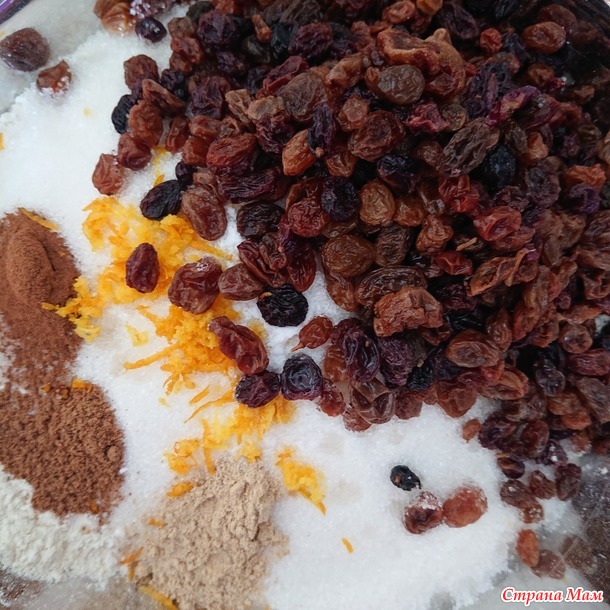 2. Берем отдельную глубокую миску и насыпаем в нее фитпарад (сахар), муку, крахмал, специи (имбирь, корица, мускатный орех, куркума, цедра апельсина) и изюм, перемешиваем.