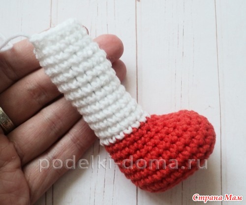 Надеваем гетры на ножки и прихватываем их снизу.
