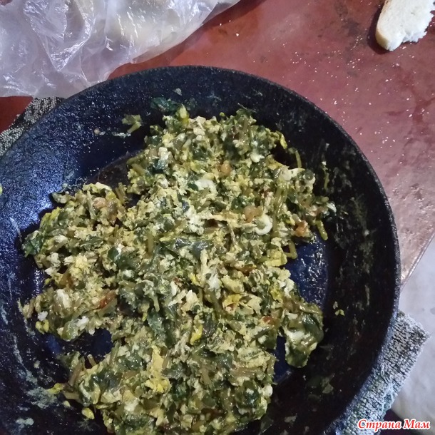 можно убавить огонь и варим минут 3-4. На разогретой сковороде жарим лук. Как пожарится, кладём кусочек сливочного масла и добавляем портулак. Посолить, поперчить и потушить пару минут. Затем вбиваем яйца. Яиц кладите столько, сколько любите, я разбила 5 штук. Мешаем, пока схватиться белок. Не сушите. Все, блюдо готово. Вот как выглядит