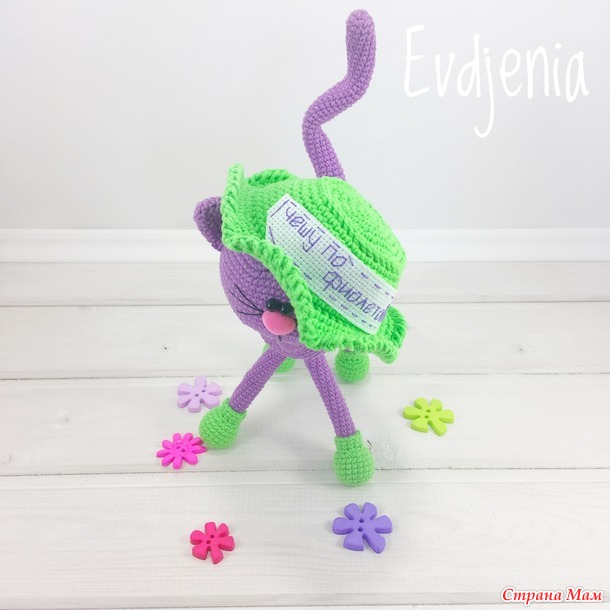 Подробное описание вязания котика на проволочном каркасе, описание вязания шляпы и вышивки надписи на ней.