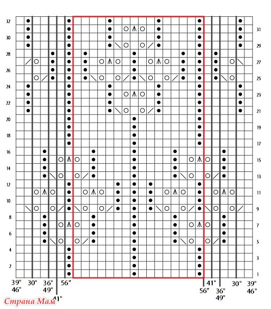 На строках изн.р. начинайте там, где указано для вашего размера в таблице слева, вяжите до конца раппорта, выполните 4 (5, 5, 6, 6, 7, 8) повторения раппорта, затем закончите, где указано для вашего размера в правой стороне схемы.