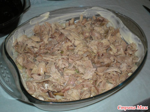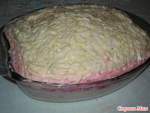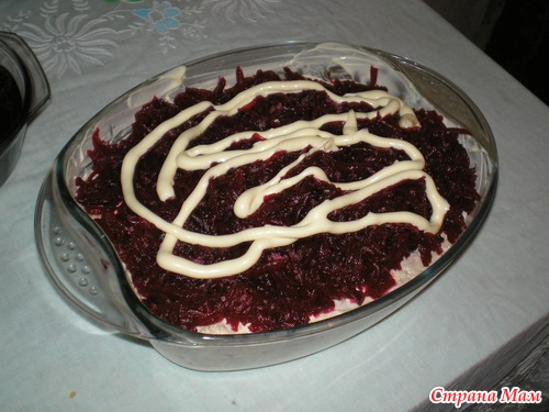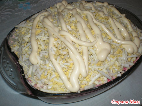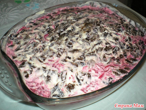 остается только по желанию украсить, у меня к сожалению не хватило времени-молокососущие пайка потребовали. ставим в холодильник на пропитку, я обычно на ночь делаю. Надеюсь что кому-нибудь он понравится!!! Вот такой муж довольный -когда видит на столе свой салатик
